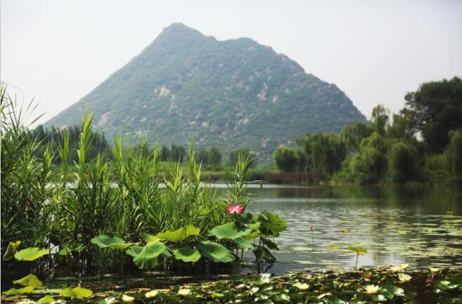 济南华山又名华不(fū)注山,其名取自于《诗经·小雅·常棣》,其诗曰:“常(棠)棣之华,鄂不䎬䎬”。“华”即“花”,“鄂不”即“萼跗”,谓之花蒂。山名“华不注”,意为此山如花跗注于水中。经过紧张的恢复整治,目前,“华不注”的山水胜景初现,“水中起芙蓉”的旖旎景观又一次展现在世人面前。