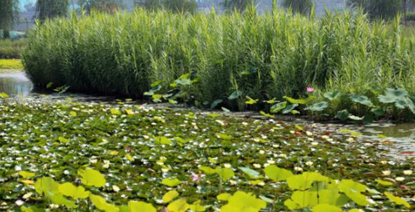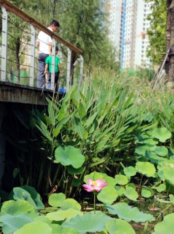 湿地园林一期景观栽种了100多种植物,有旱柳、国槐等济南本地树种,还有荷花、芦苇等20多种水生植物,良好的生态环境吸引了不少白鹭、䴙䴘等鸟类栖息,“棹动芙蓉落,船移白鹭飞”。