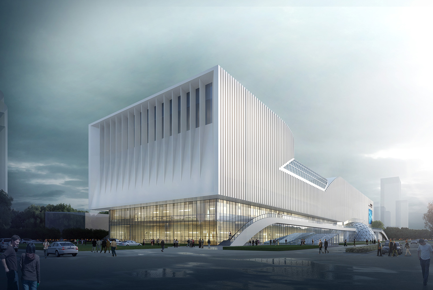 科技馆主体建筑位于场地中央,场地主入口位于北侧日照路一侧,参观人员由北面进入科技馆,北侧广场设有排队进场的广场集散区域。场地南侧沿规划道路设置多个出入口,西侧为双创中心与科研人员出入口,中部为科技馆次入口及团体入口。建筑东侧为临时展厅出入口,可独立举办各种展览活动,场地西侧结合腊山河景观带设有一个地景化的绿坡平台,平台将场地的车流和参观游览的人流从高度上完全分离开。