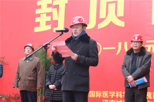 、济南国际医学科学中心槐荫区重点项目指挥部、吴家堡街道办事处及项目管理单位、审计、监理单位、施工单位的相关负责人和工人代表共同见证项目封顶。