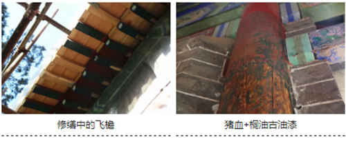 华阳宫现存古建多为明清建筑,建筑油漆都是采用“猪血+桐油”的古法油漆,此次修缮过程中,涂刷的新油漆也全部采用该种古法工艺。