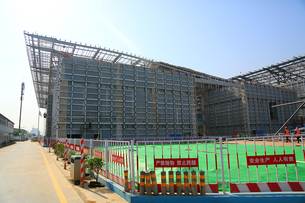 4号馆、5号馆结构均已施工完成,目前处于金属屋面、幕墙及内部装饰阶段。其中,4号馆金属屋面主、次龙骨安装完成100%,幕墙预埋件安装完成100%;5号馆金属屋面开始封闭,吊顶底板安装完成30%,幕墙龙骨安装完成50%。正在进行幕墙样板段及内部装修样板间施工。