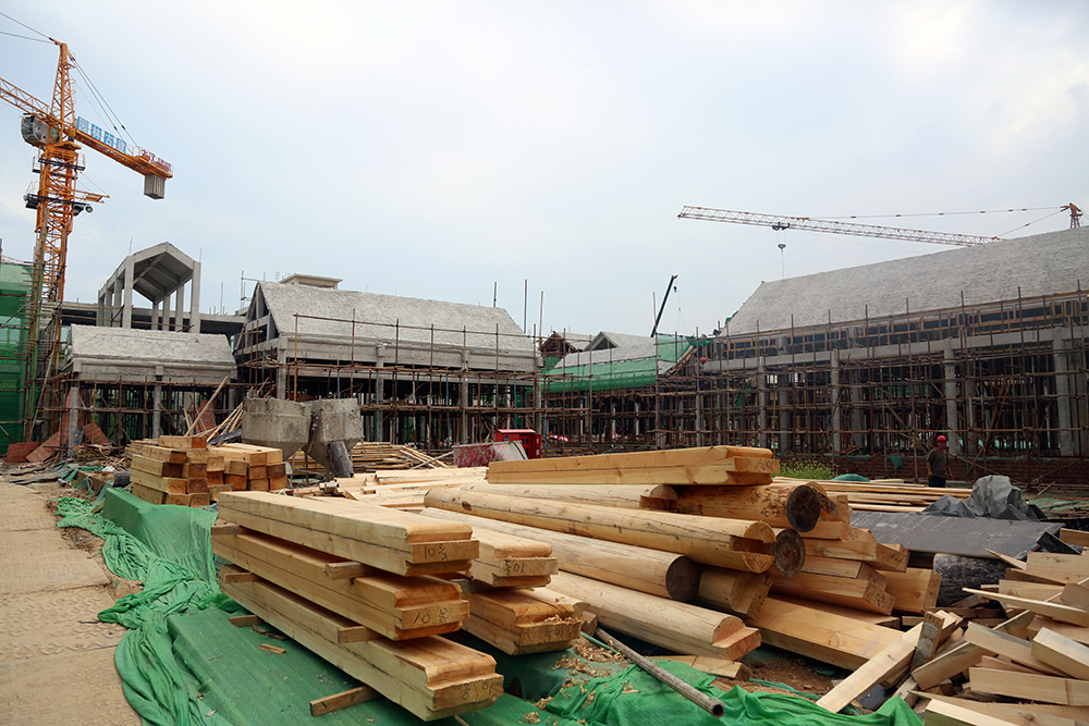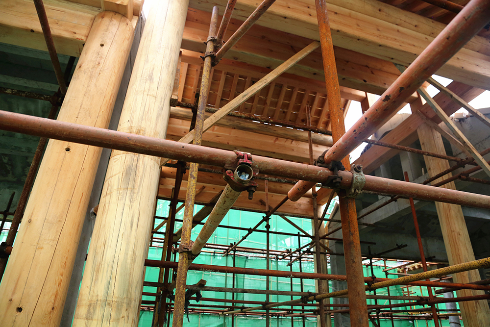 为消防安全考虑,项目建筑的屋顶及大部分构件都摒弃了木质结构,统一采用钢筋混凝土结构。虽然采用了现代材料,但是施工复杂程度却比原始工艺大的多。“屋顶的构件要用专门定制的模板逐层浇筑,较长的房梁还要逐段拼接,同时又要保证细节到位,做起来就比较耗时”,现场负责人介绍道。在项目入口处,有一栋小型建筑为全木制结构,据介绍,这栋建筑仅用三天就建造完成,而如果采用钢筋混凝土结构,至少需要20天工期。