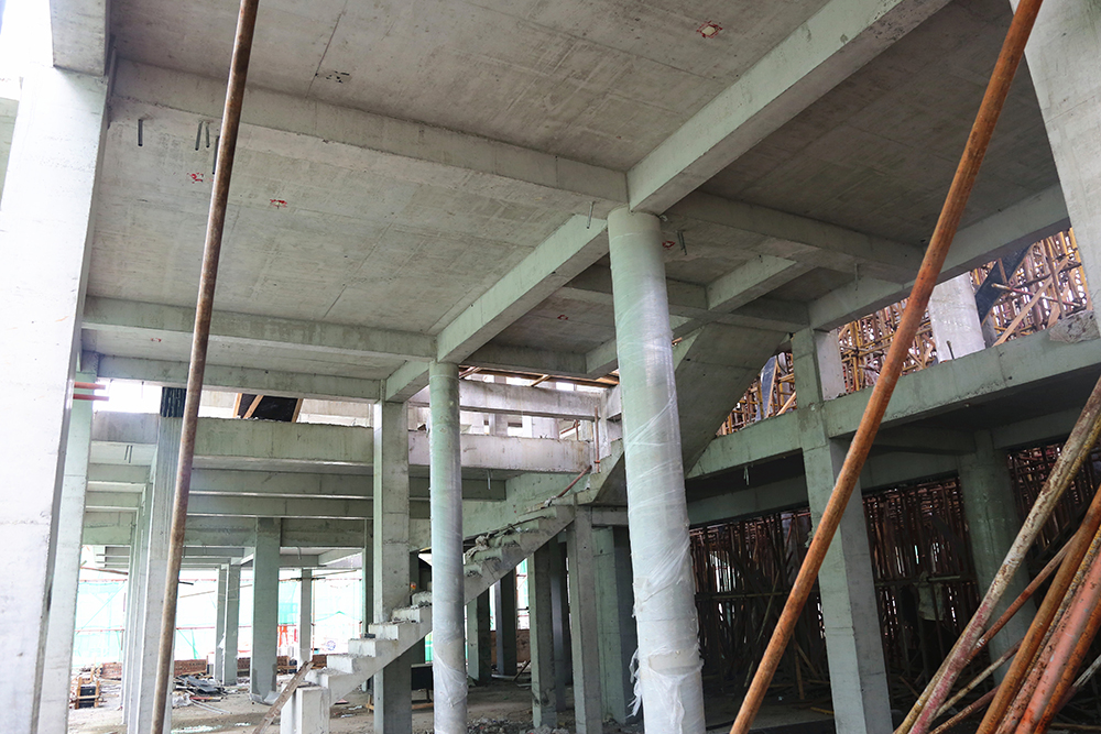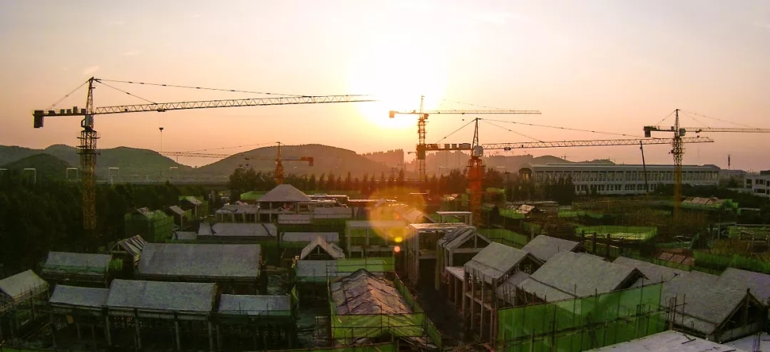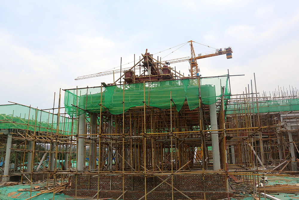 城门楼的工程量最大,项目内施工难度最大的是紧靠城门楼的一栋2.5层(局部三层)的中西结合建筑,该建筑内部为错层结构,楼板需要逐层浇筑,同时还有单层挑高8米的高支模(高支模是指支模高度大于或等于5m时的支模作业)作业,施工方案经专家反复论证后施行,为保证工期,这栋2.5层的“小建筑”最多80位工人同时施工。同样,为了整个项目的推进速度,项目高峰作业期400多位工人同时施工,保证项目按质按量推进。