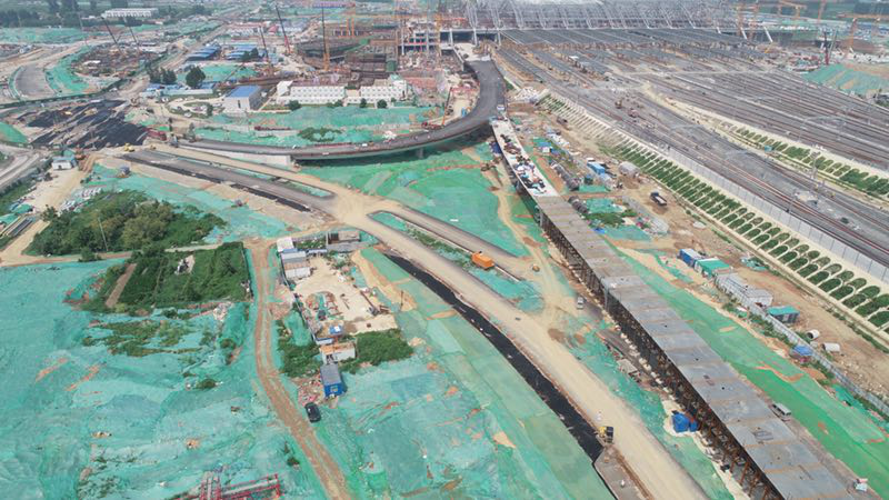 承建的新东站交通路网已初现雏形,在东客站综合交通枢纽进出场道路施工现场上,设备轰鸣不停,工人挥汗如雨,新东站交通路网建设“攻坚战”正酣。