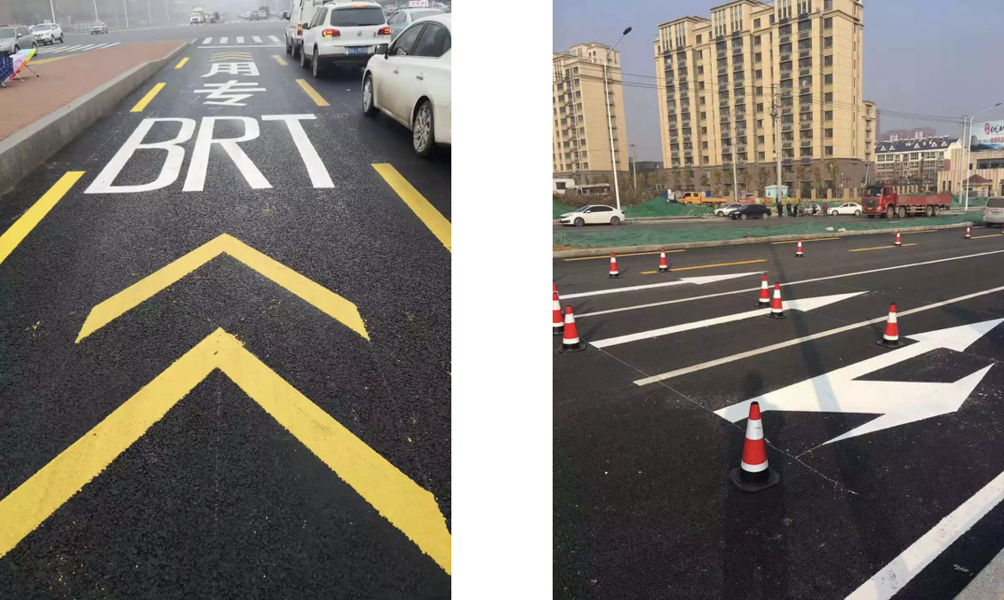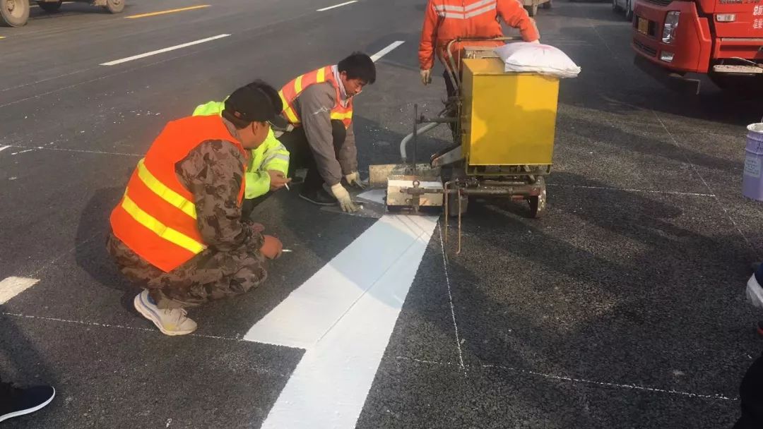 双组份高亮标线涂料的主要原料是 “甲基丙烯酸甲酯”(英文缩写MMA),此次路面标线施划的标线涂料全部采用MMA双组份,具体施工内容为MMA双组份标线(刮涂)6100㎡、MMA双组份标线(甩涂)4300㎡、MMA双组份标线(喷涂)2200㎡。