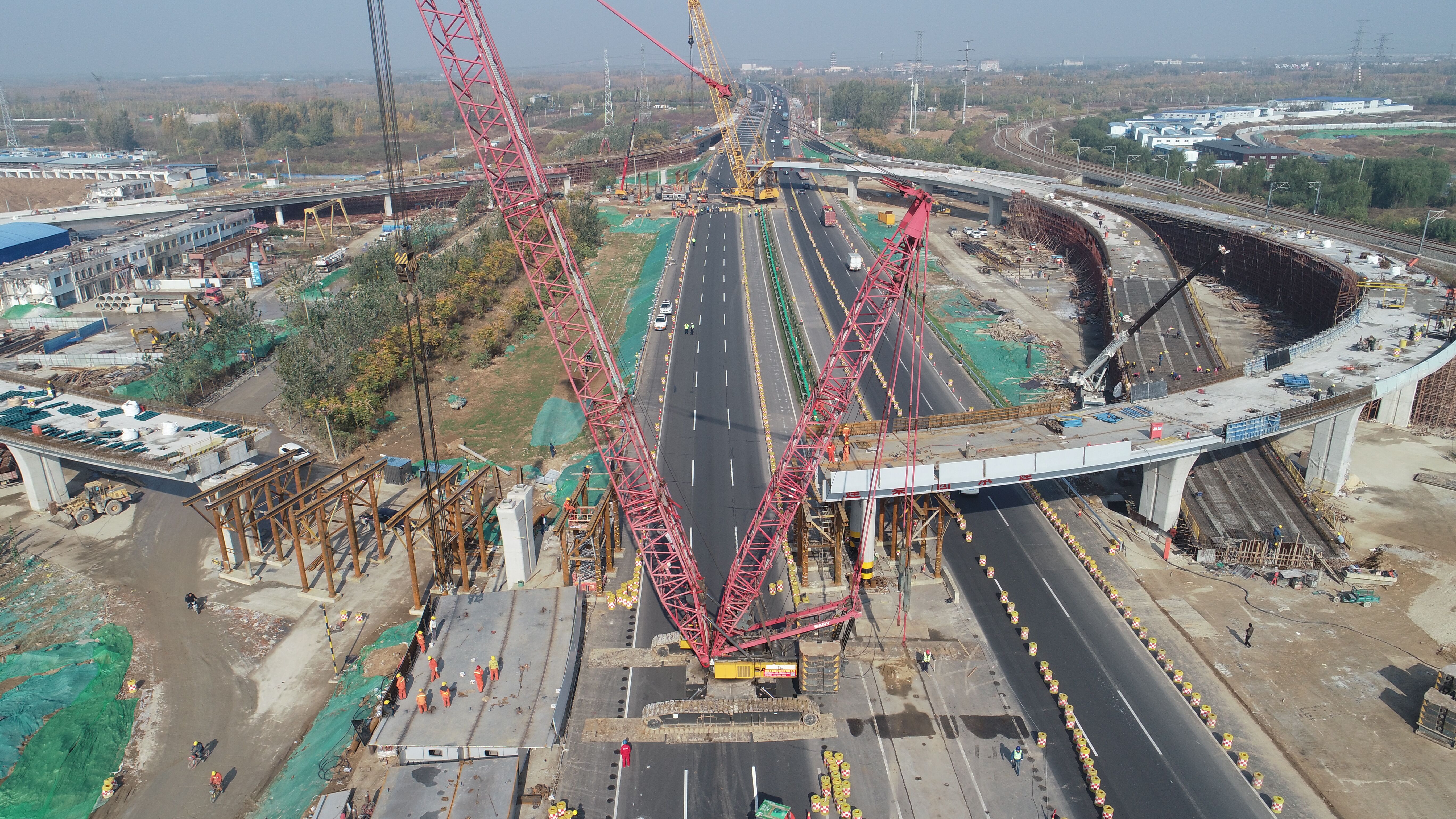 跨京台高速钢箱梁吊装是整个工程极为关键的节点,吊装段位于跨京台高速的南北两处匝道,分别长54米和60米,每段重达170余吨,起吊吨位大,施工过程需克服跨京台高速、高空作业等不利因素,城建集团周密筹划、科学组织,先后5次邀请行业内专家召开专项论证会,最终确定“单向封闭,两匝道同时吊装”方案,加大人、机、物投入,把整个作业时间由计划5个半小时缩短至不到4小时,将高速通行影响降到最低,为工程节约了5天宝贵时间,为项目通车奠定坚实基础。