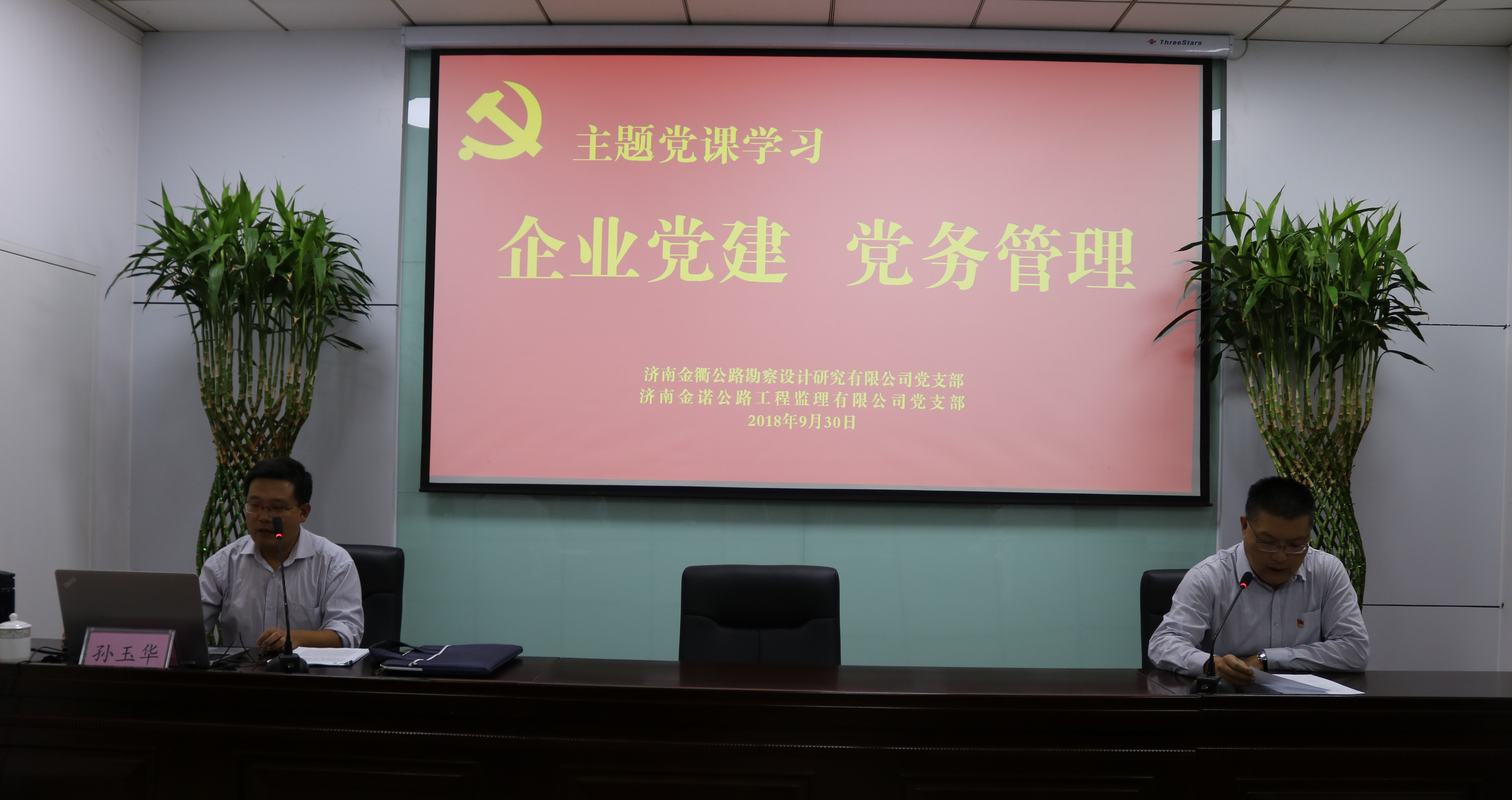 为贯彻落实新时代党的建设总要求,进一步加强国有企业党的领导与建设,提高党员干部思想政治素质,增强党性修养,夯实党建工作基础,2018年9月30日下午,济南金衢公路勘察设计研究有限公司党支部、济南金诺公路工程监理有限公司党支部组织全体党员、中层及以上干部、积极分子五十余人在金衢公司第一会议室进行党课学习。