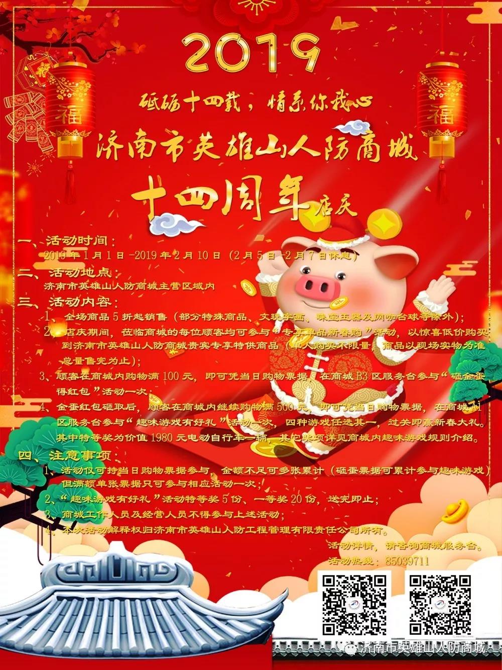 “十全十美,四海承平”。济南市英雄山人防商城“相伴十四周年,共迎美好新年”主题十四周年店庆系列惠民活动将于二〇一九年元月一日正式启动!