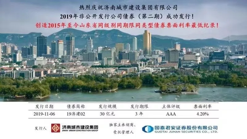 非公开发行2019年公司债券(第二期)(“19济建02”)发行圆满落地,创造2015年至今山东省同级别同期限同类型债券票面利率最低纪录。本期债券发行得到了市场的广泛认可,投资者认购踊跃。19济建02低利率发行,充分展现了投资者对av中文