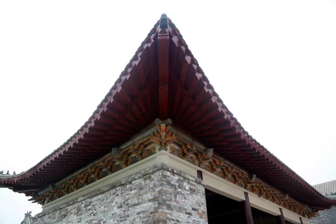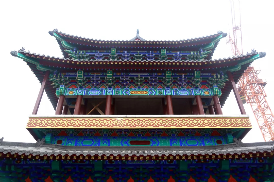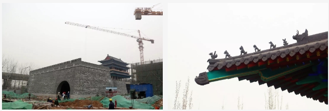 项目所有建筑中,城门楼是工程量最大、工期最长的单体建筑,其中,城墙全部采用手工砖砌筑,经过人工修整后的砖块古朴素雅,并无过分雕饰痕迹。进入城门楼内部,柱与梁之间均为传统木质斗拱支撑,城门楼的彩绘部分尤为明亮突出,采用的是旋子彩绘形式,一般经过6道工序,一平方米的彩绘需要一名绘画师傅耗时约半天一次成型。