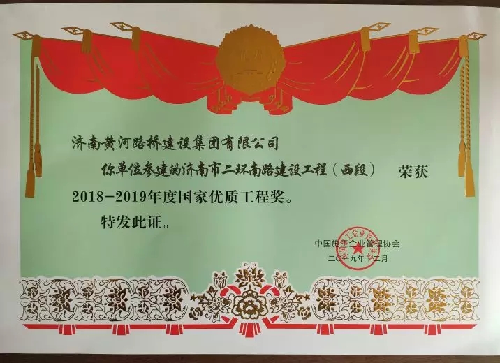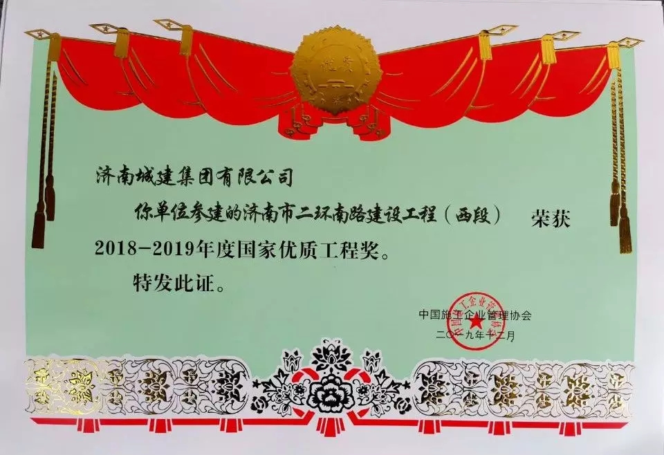 、济南城建集团有限公司分标段承建的济南市二环南路建设工程(西段)荣获“2018-2019年度国家优质工程奖”。