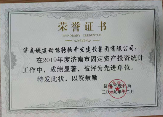 荣获济南市统计局“2019年度济南市固定资产投资统计工作先进单位”称号,冷见奇、潘文凯、周宇三名同志被评为“固定资产投资统计工作先进个人”。
