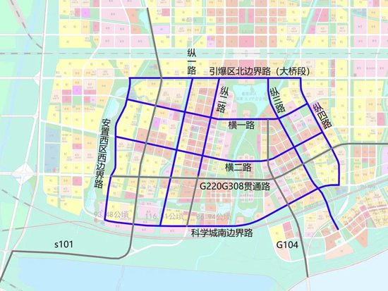 大桥组团:引爆区北边界路(大桥段)、横一路、横二路、G220G308贯通路、科学城南边界路、安置西区西边界路、S101、纵一路、纵二路、G104、纵三路、纵四路;