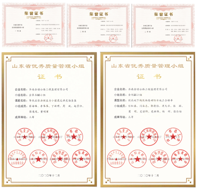 质量是企业的生命,工程质量是工程建设的核心。金诺公司积极组织科技工作者参加全面质量管理培训、鼓励科技工作者依托监理服务项目开展全面质量管理活动。2020年度金诺公司组建了10个QC小组,取得QC成果11篇。其中4个QC小组(成果)获地市级奖项,4个QC小组(成果)获省部级奖项。