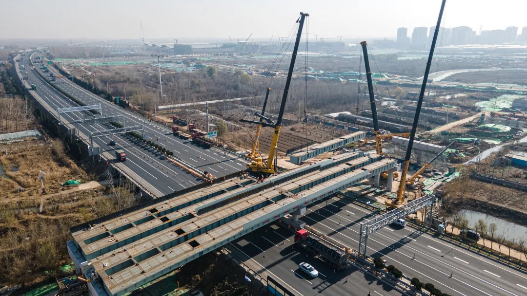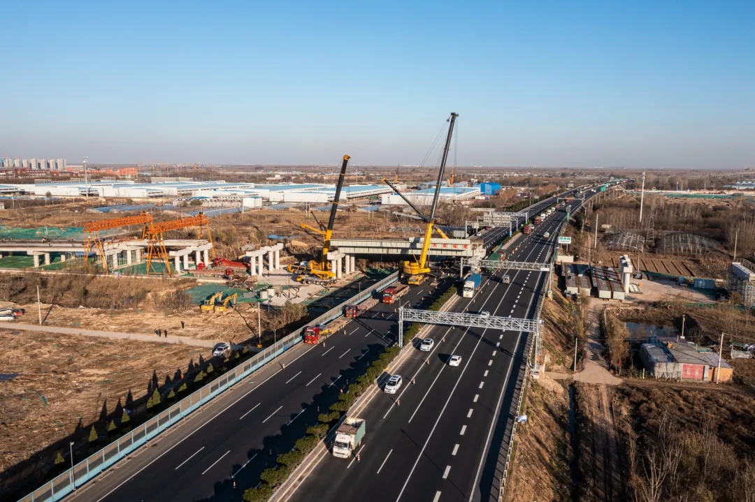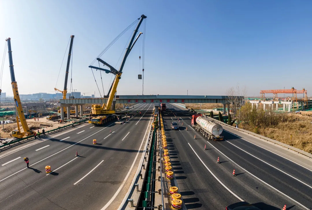 受委托建设,集团所属济南城建集团有限公司第四分公司负责施工建设的济南新旧动能转换起步区智慧物流园区二期工程一标段西环路跨线桥钢箱梁吊装完成,顺利跨越青银高速。