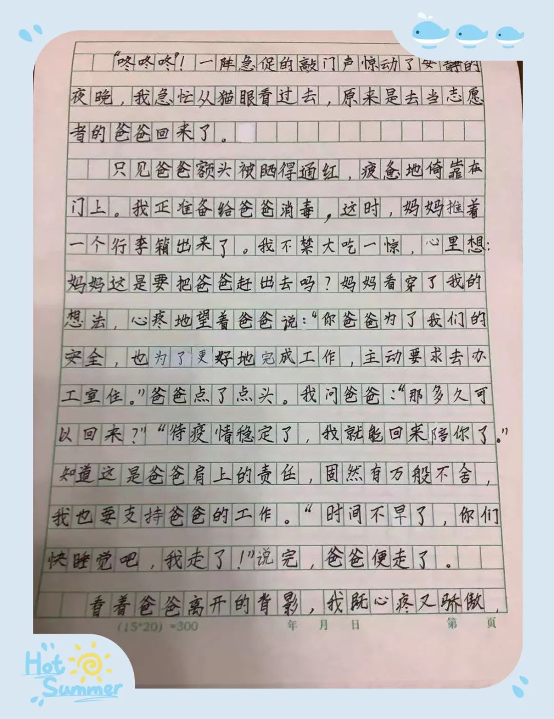 “知道这是爸爸肩上的责任,固然有万般不舍,我也要支持爸爸的工作”“看着爸爸离开的背影,我既心疼又骄傲,心疼爸爸辛苦工作,但又为有这样为人民服务的爸爸感到发自内心的骄傲!”这是11岁的荣浩霖小朋友写的作文“我的爸爸”。