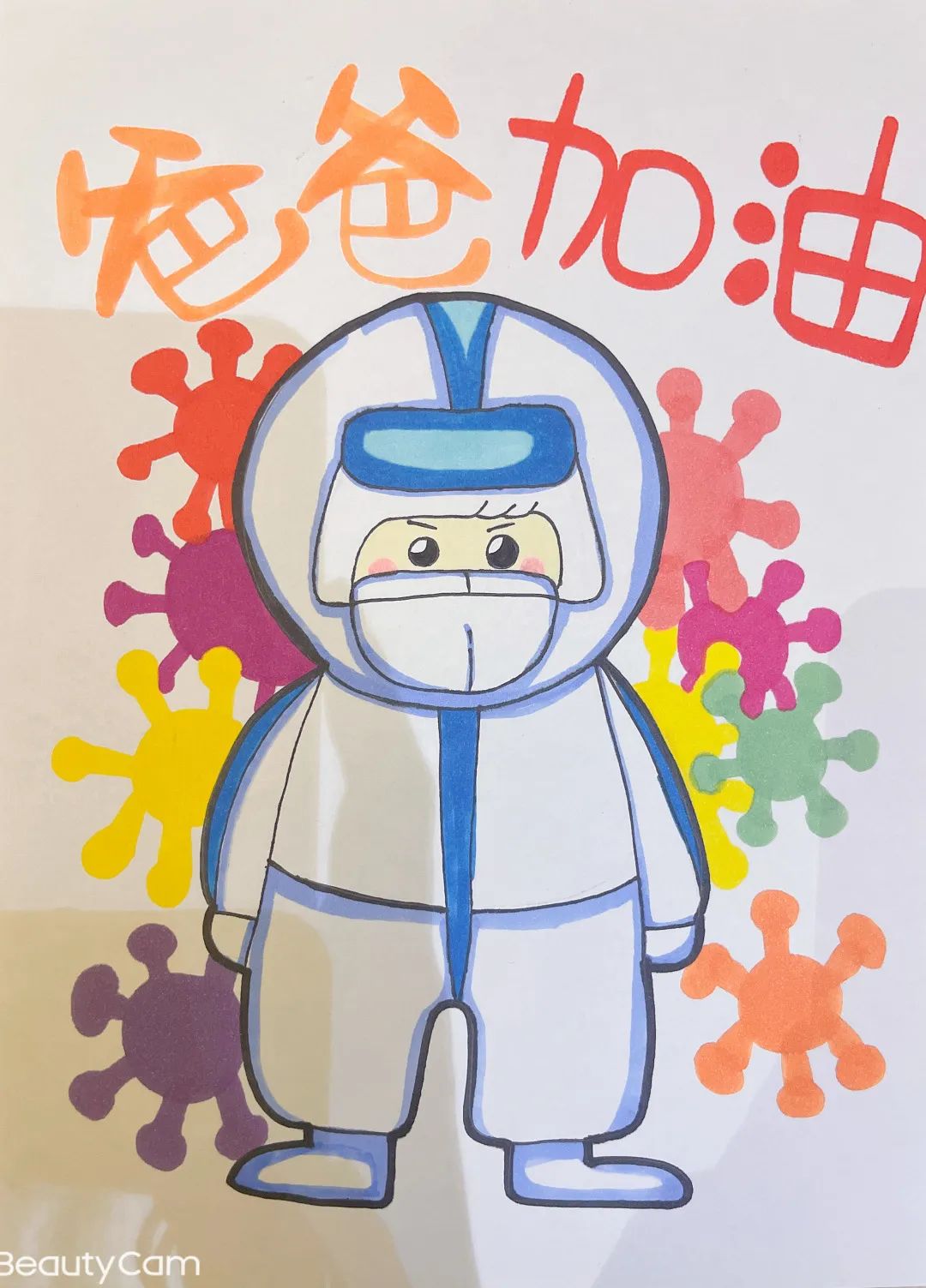 所属济南城建集团公司下沉南苑社区服务中心的志愿者杜谦12岁女儿之手。一身洁白的防护服,戴着厚实的口罩,只露出一双炯炯有神目光坚定的大眼睛,这是女儿心中爸爸最帅的形象。