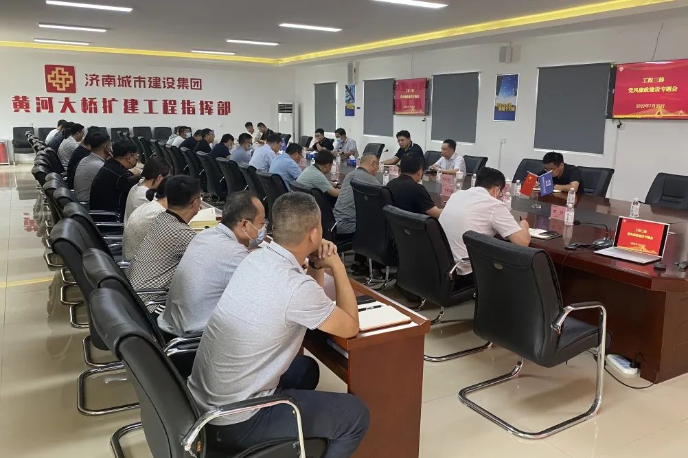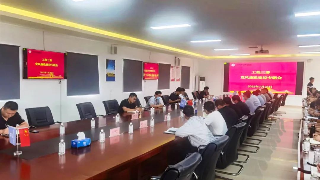 为全面贯彻集团党委关于加强新时代廉洁文化建设的会议精神,加强支部党风廉政建设工作,把全面从严治党要求落到实处,7月28日,集团工程三部党支部召开2022年党风廉政建设专题会议。