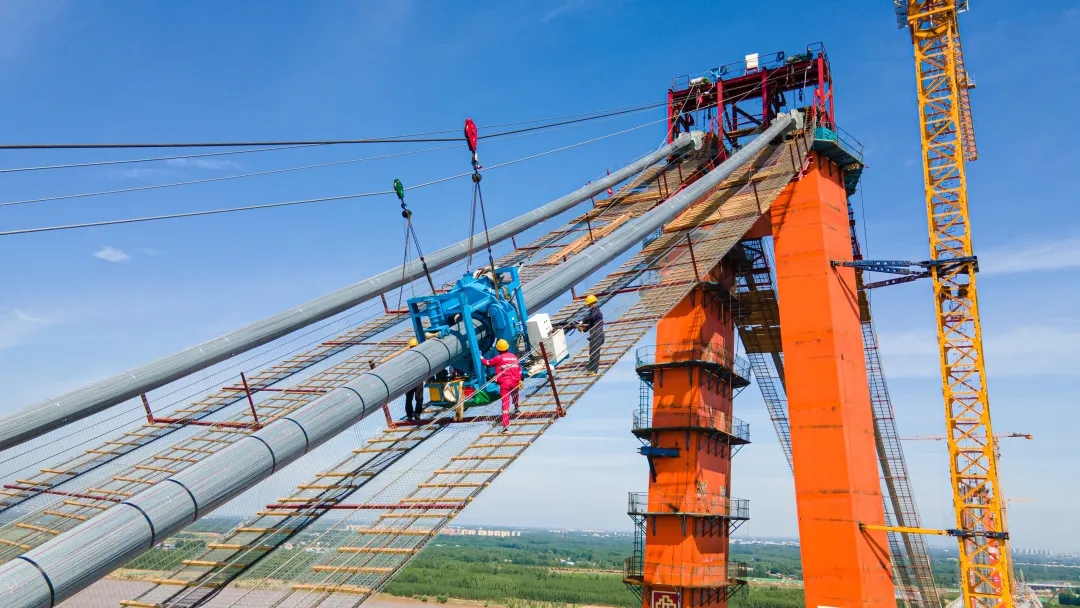 革新之桥。项目施工过程中,对施工工艺及技术装备进行了大革新。黄河自古就有“有水不能行舟、无水不能通车”的特点,施工水域不通航,而且没有大型水上起重设备,现场钢结构施工难度极大。通过一系列施工工艺及技术装备革新,实现了钢箱梁大节段工厂化制造、智能化运输及提升、信息化多点步履式顶推等施工方式,在保障施工安全的前提下,大大提升了推进效率。