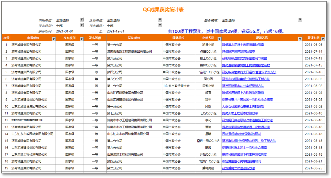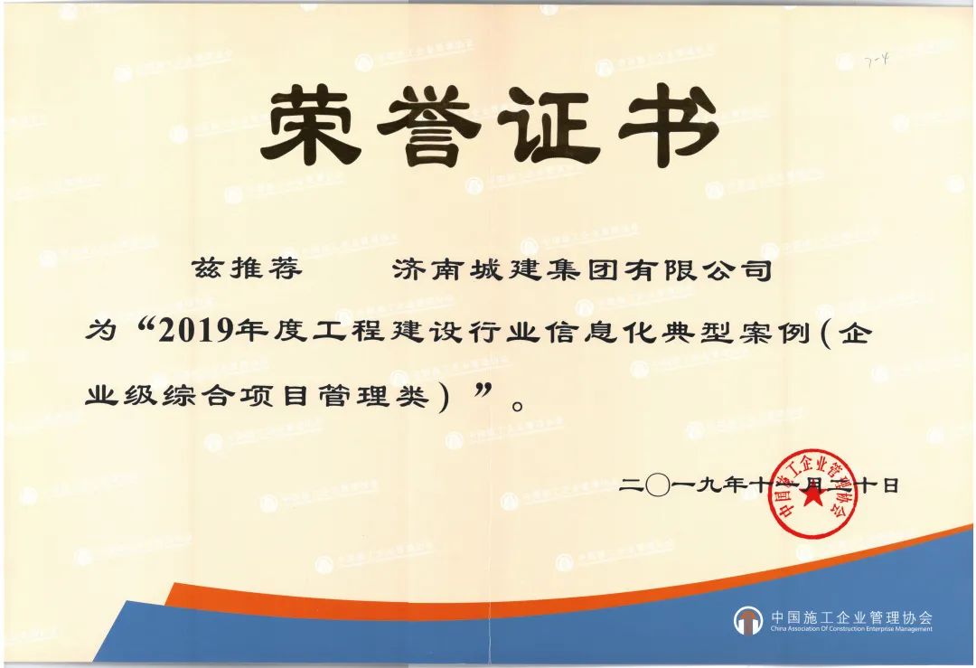 “城建集团公司在2011年以特级资质申报为契机,全面启动了数字信息化建设,期间不断优化升级的‘1+N’数字化管理系统在2016-2018年连续三次获中国建筑业协会‘最佳实践案例’,2019年被中国施工企业协会评为‘年度企业级信息集成系统应用推荐案例’,其中当年其他三家获评单位均为央企,并且济南城建是唯一一家覆盖全部项目、全部成本要素,能够核算出整个项目成本的案例”,济南城建集团有限公司党委书记、董事长、总经理牟晓岩在市政工程企业数字化管控实践观摩会作典型经验介绍时说道。