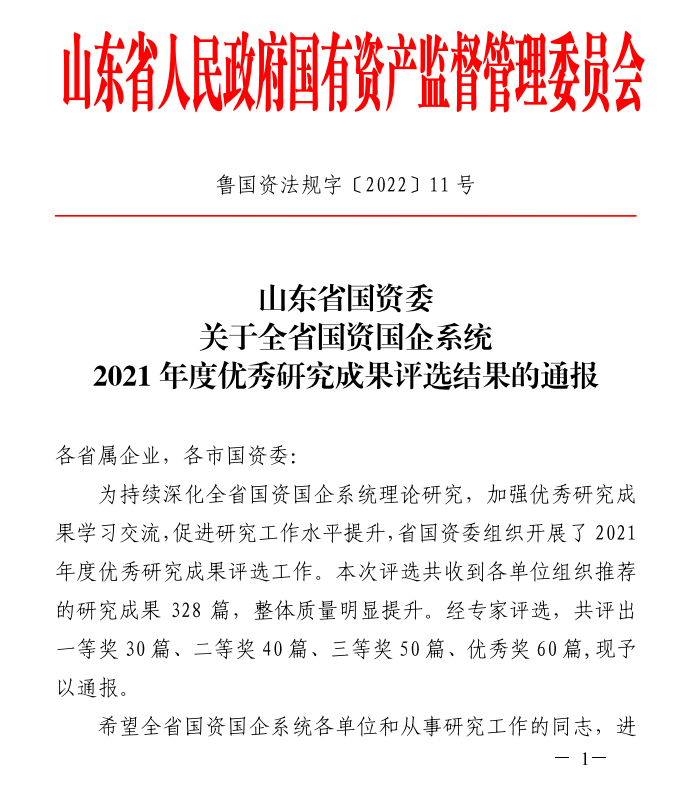 近日,山东省国资委发布了《山东省国资委关于全省国资国企系统2021年度优秀研究成果评选结果的通报》(鲁国资法规字〔2022〕11号)文件,av中文