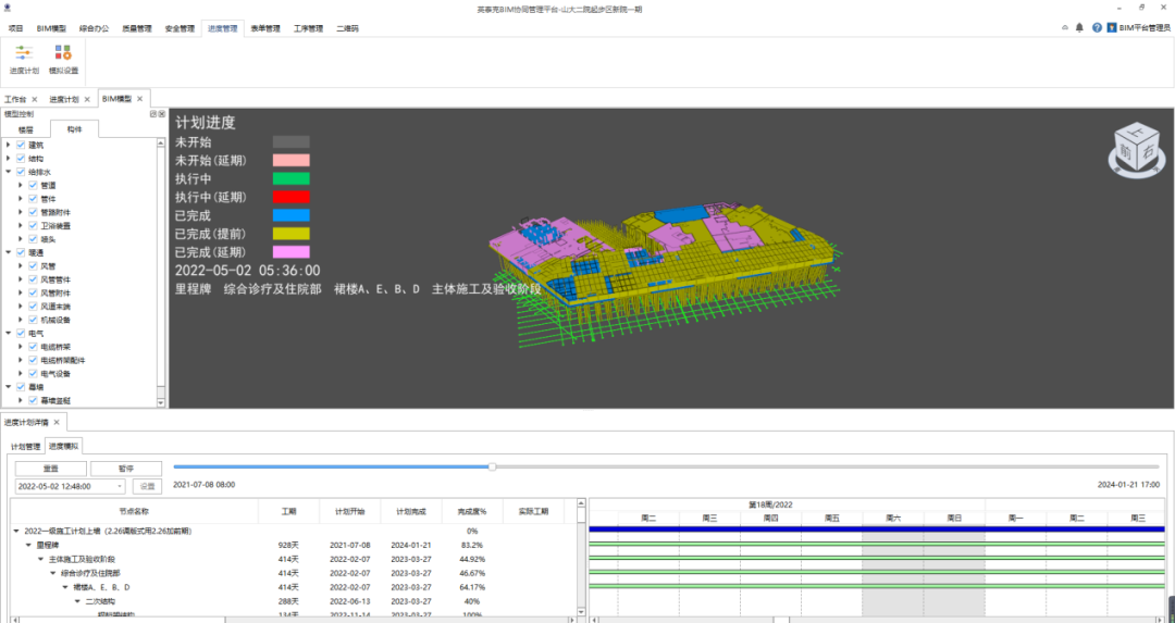 结合项目结构超限设计的实际,为从根本上解决因后浇带设置过多而产生的进度、质量、安全文明问题,论证实施了“跳仓法”施工工艺,按“块料规划、块料施工、分层浇注、整体成型”的原则施工,加大资源调配力度,在节约工期的同时,实现文明施工、质量控制、进度管理有益结合。深入推进BIM全过程管理应用,实现以BIM模型为基础的三维图纸审查、碰撞检测、净高分析、设计方案比选、施工模型深化、管线综合、进度模拟、数据共享等功能,为施工方案编制论证、进度检查反馈、图纸审查评价等多方面提供了多维度的强大支持。