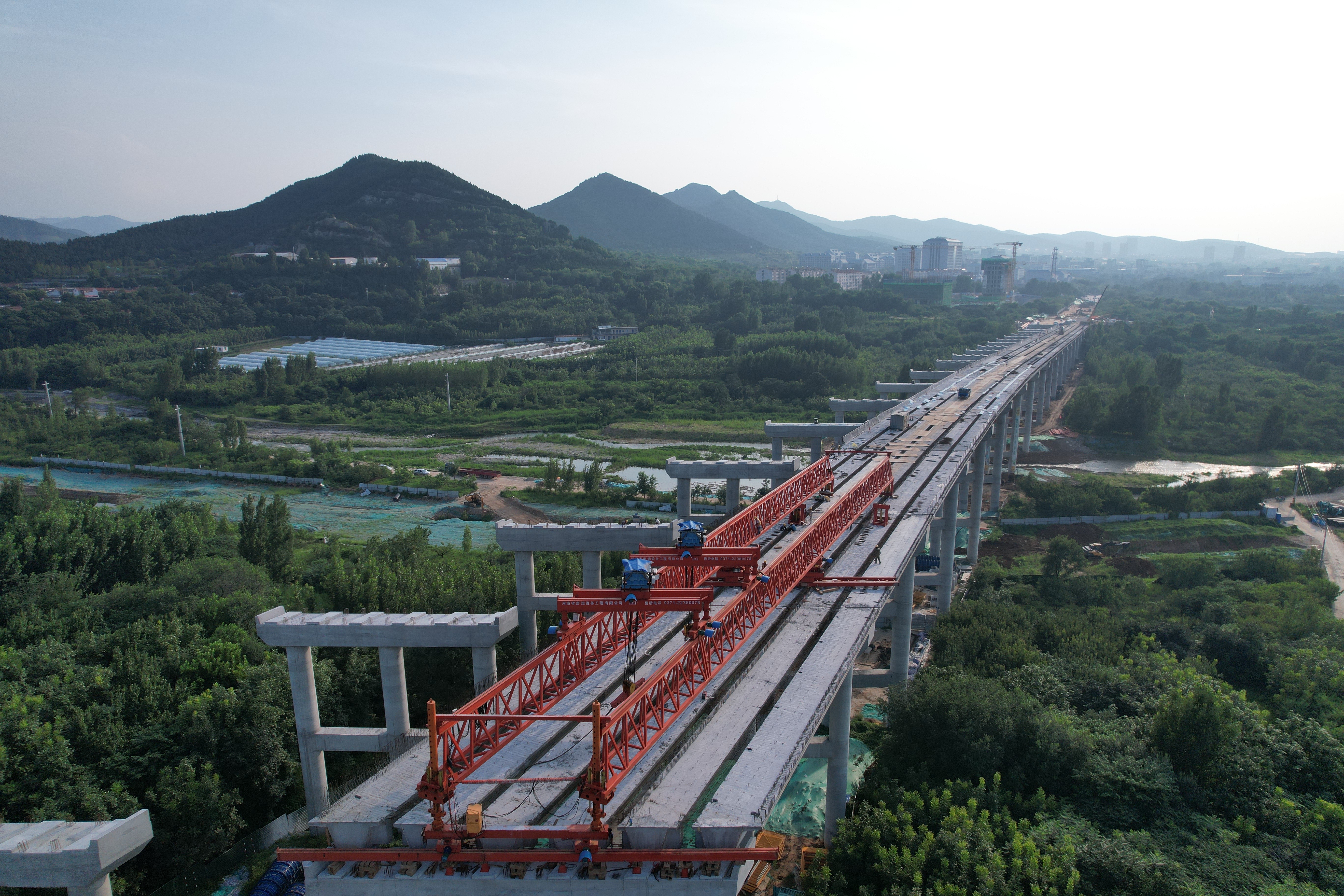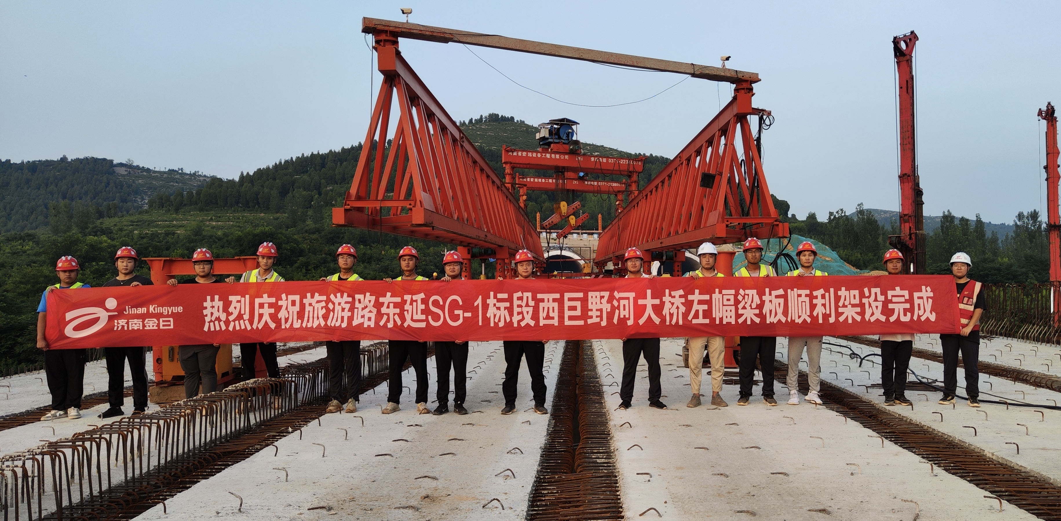 所属济南金曰公路工程有限公司承建的旅游路东延项目西巨野河大桥左幅梁板架设全部完成,为后续桥面系施工奠定了坚实基础。截至目前,本标段桥梁工程完成约80%,路基工程完成约83%,剩余管线及附属设施施工有序进行中。