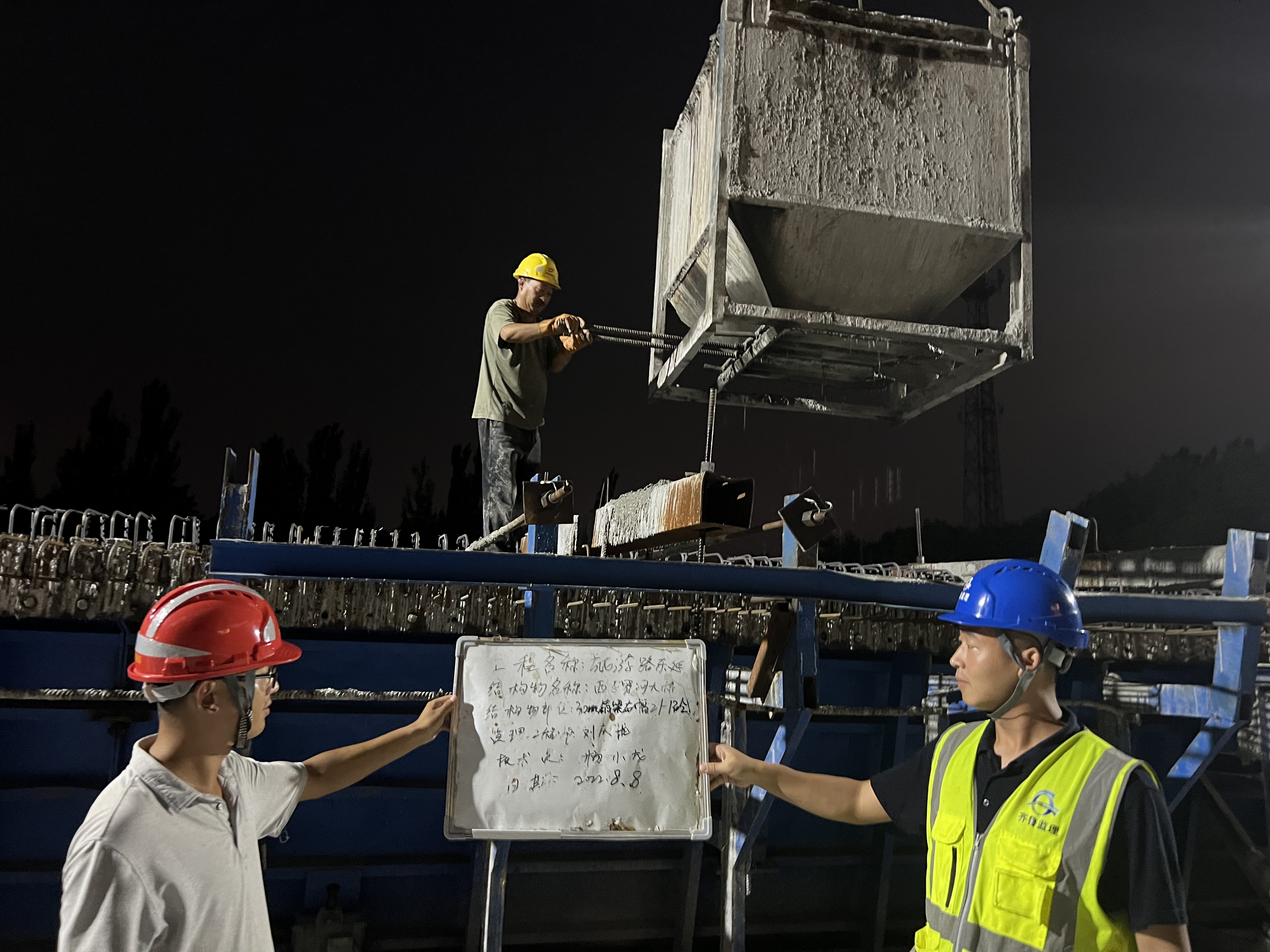 梁板预制于2021年9月24日开始持续稳产,梁场采用复合5+1mm不锈钢模板、智能张拉设备、智能压浆设备和自动喷淋养护等先进工装设备,从而确保预制箱梁质量可控;圣井道材中心预制场于9月6日完成了西巨野河大桥全部箱梁预制工作。