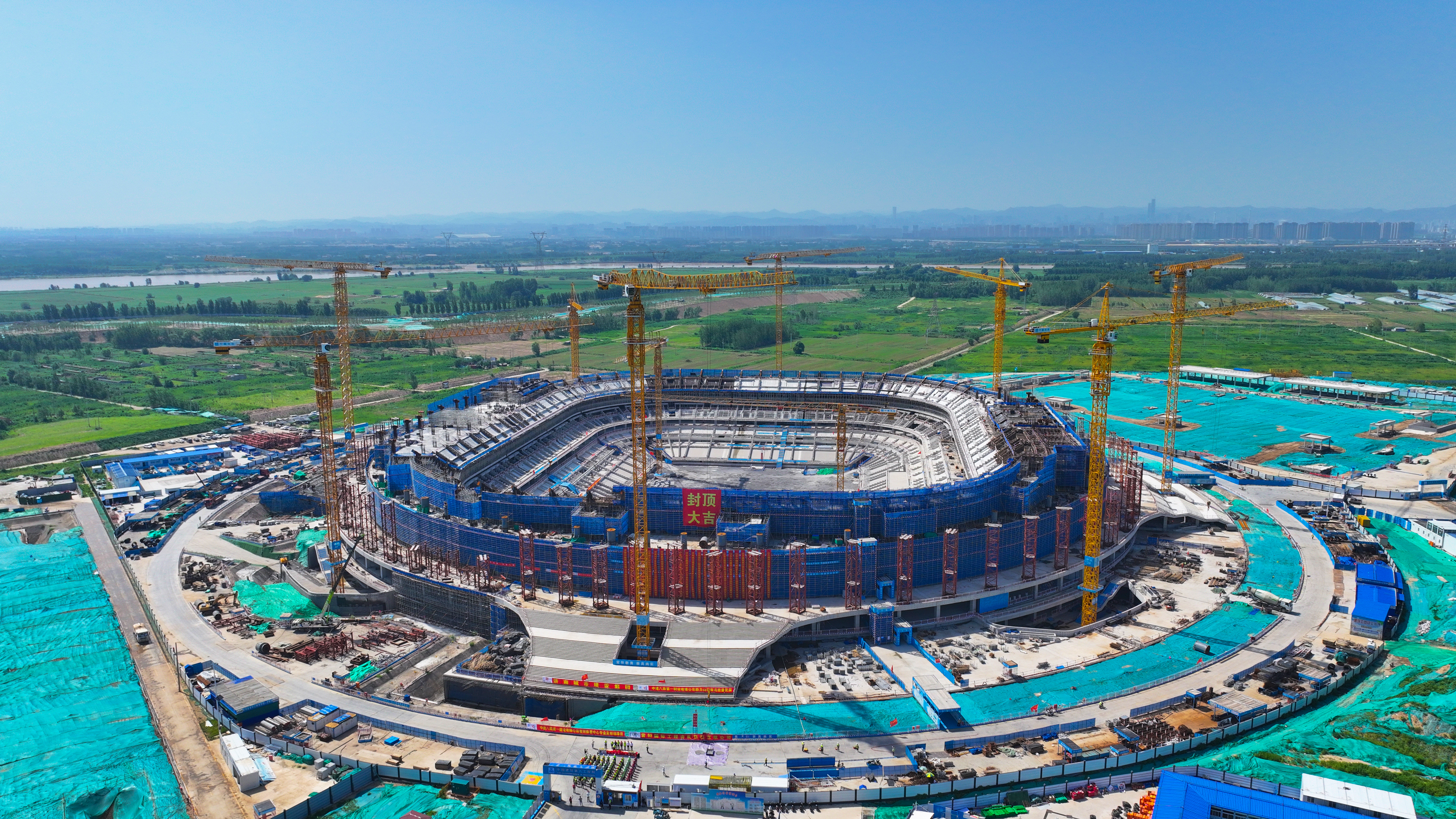 项目体量大、结构复杂、施工难度高,是体育场中的“超级工程”。项目在2022年7月2日正式开工后,项目部采用“网格化分区、平行流水作业”理念,高峰时期超1700名建设者并肩奋战,仅用40天完成2450颗桩基施工,60天完成50万方土方开挖,90天完成7000余吨筏板钢筋安装,114天完成13.5万方混凝土浇筑,371天完成主体结构封顶,所有预期节点全部按时达标。