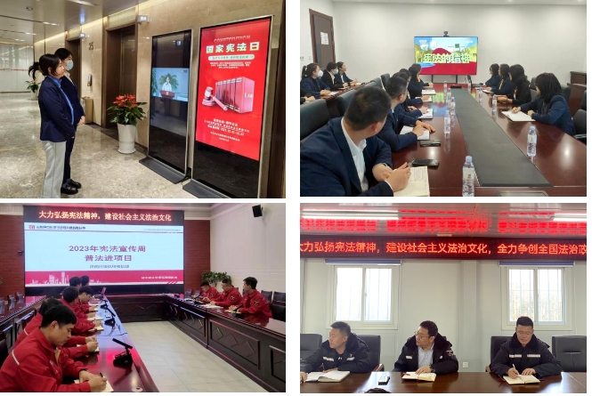 《关于开展2023年宪法宣传周、法治宣传教育月暨争创全国法治政府建设示范市集中宣传活动的通知》文件精神,公司负责同志强调,宪法是国家的根本法,是公民权利的保障书,治国安邦的总章程,希望广大干部员工自觉维护宪法权威,争做宪法精神的忠实崇尚者、严格遵守者、自觉运用者和坚定捍卫者,奋力营造集团公司尊法学法守法用法的浓厚氛围;组织开展2023年全国“宪法宣传周”宪法知识网上竞答活动,认真组织全体员工每日参与网上竞答活动;利用微信工作群平台,发布“大力弘扬宪法精神,建设社会主义法治文化”倡议书,号召集团公司全体员工深入了解宪法,进一步增强忠于宪法、遵守宪法、维护宪法的行动自觉。