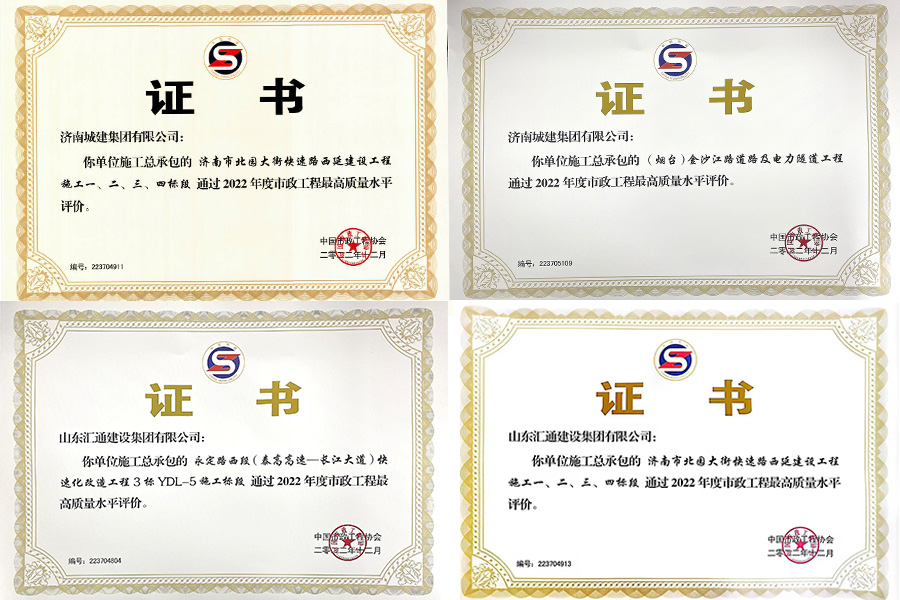 所属济南城建集团公司承建的济南市北园大街快速路西延建设工程、(烟台)金沙江路道路及电力隧道工程、永定路西段(泰高高速—长江大道)快速化改造工程获得四项“2022年度市政工程最高质量水平评价”。