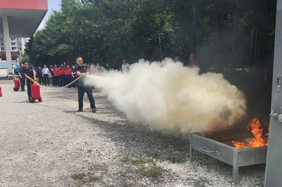 本次演练项目重点针对加油站现场加油机及车辆着火、加油容器着火开展,滨河石化总经理讲解了加油站消防安全注意事项、初始火灾处置要求、突发火灾快速响应机制等消防知识要点,详细演示灭火器、灭火毯等加油站常用消防器材的使用方法。