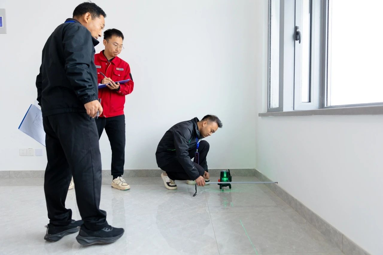 此次竞赛立足行业实际工作场景,多维度、全方位地检验参赛选手的质量检验专业知识和技能水平,设置理论考核和实际操作两部分。理论竞赛内容包括法律法规、工程测量相关规范基础知识等,实操比赛涵盖了房建工程装饰阶段的测量。