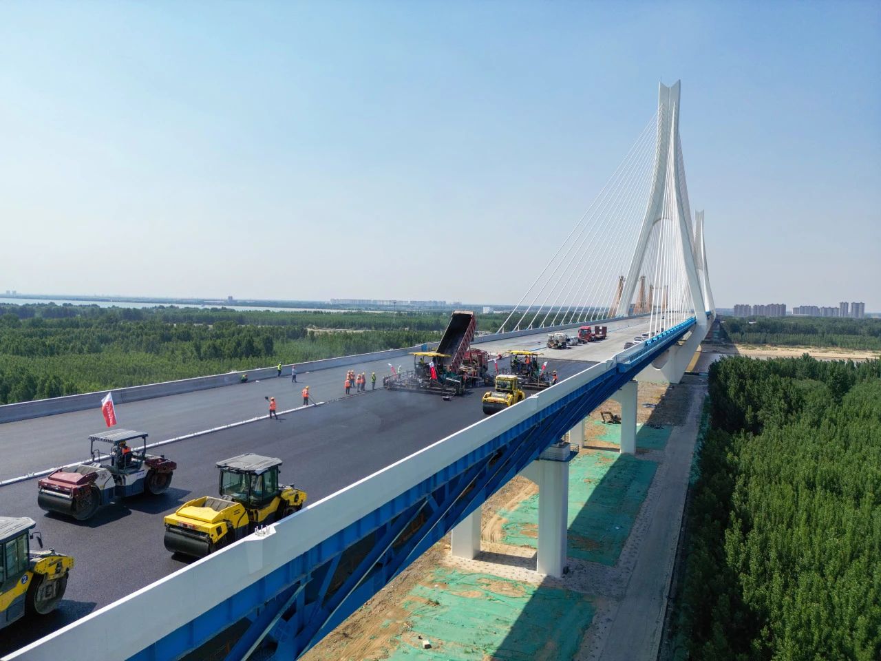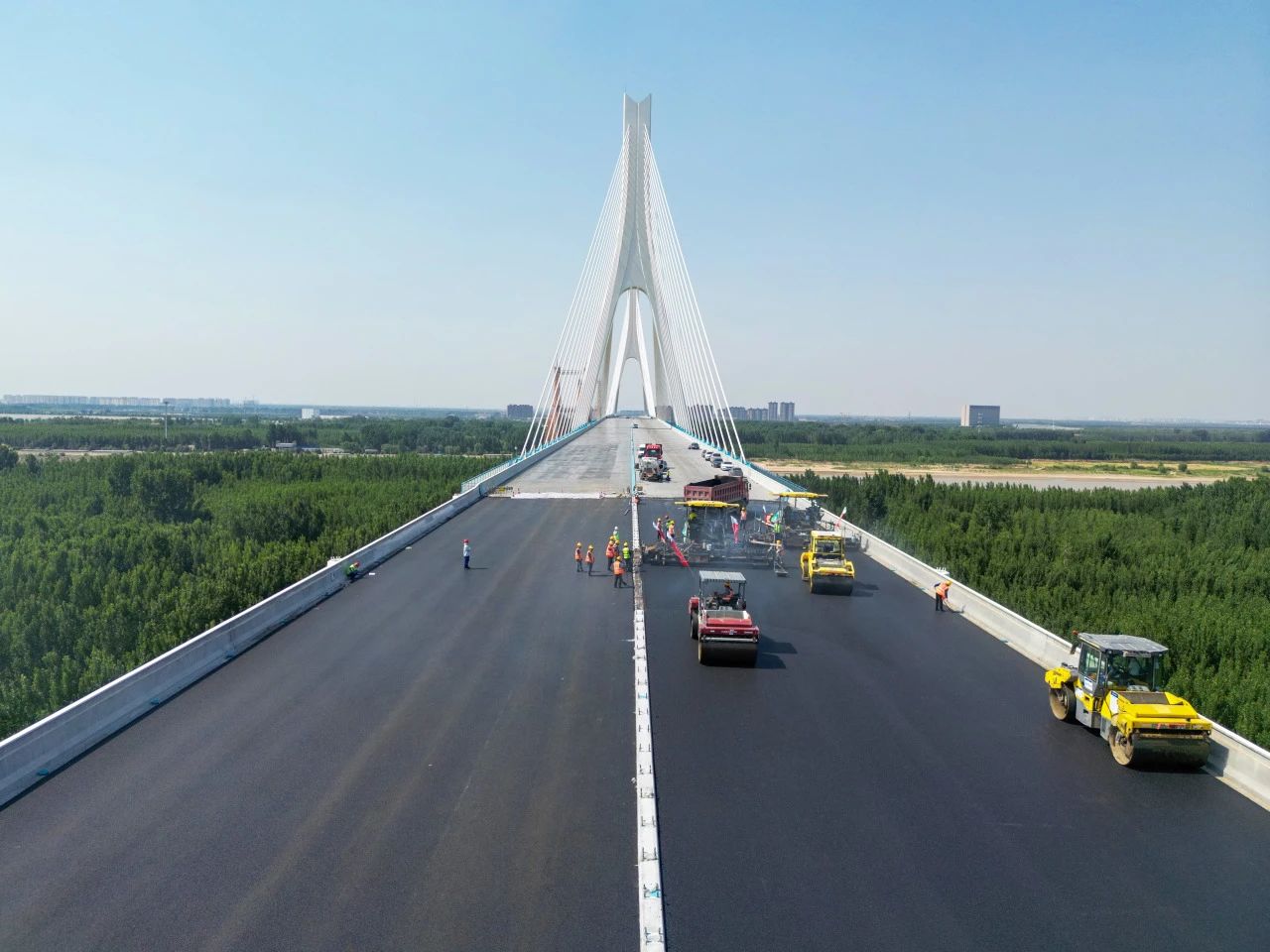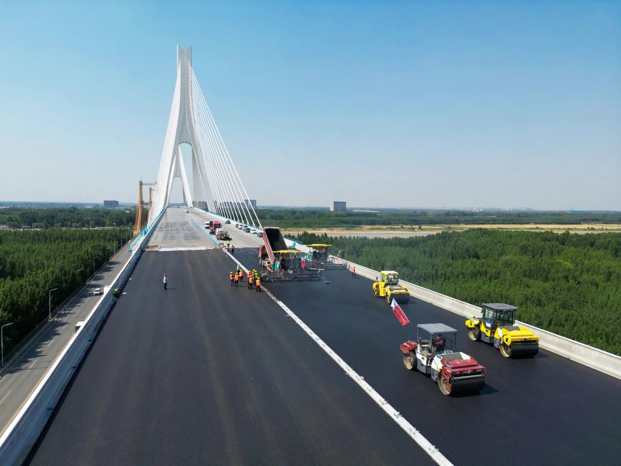 承建的G104京岚线济南黄河公路大桥扩建工程的桥面沥青摊铺工作已全面展开。目前,大桥北岸桥面沥青铺设已经完成,南岸的摊铺工作也正在紧锣密鼓地进行中,标志着大桥距离正式通车又迈出了坚实的一步。