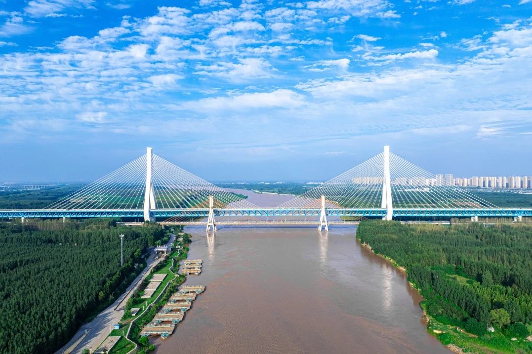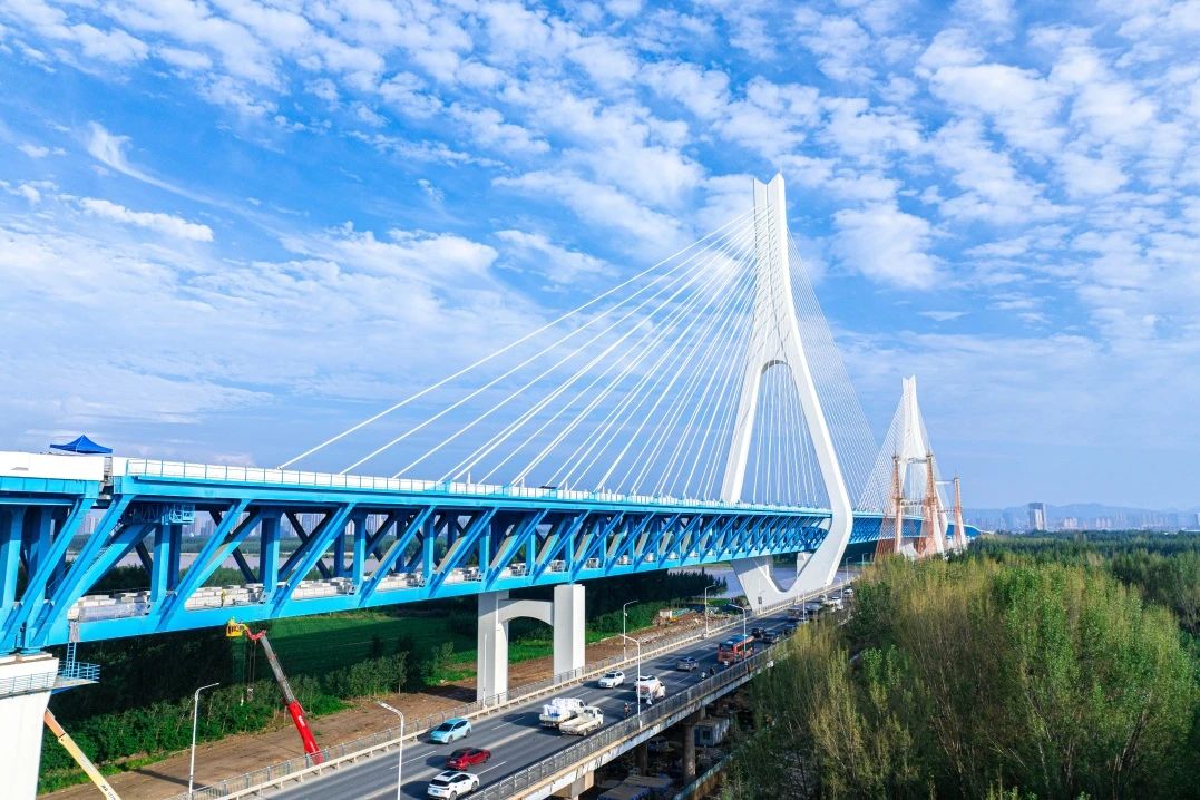 其中主桥长1028米,与老桥并行布置,新老桥中心间距33.5米,桥面净距5-7米,面高差24米,是黄河流域跨径最大、钢桥总长最长的公轨分层合建桥梁。