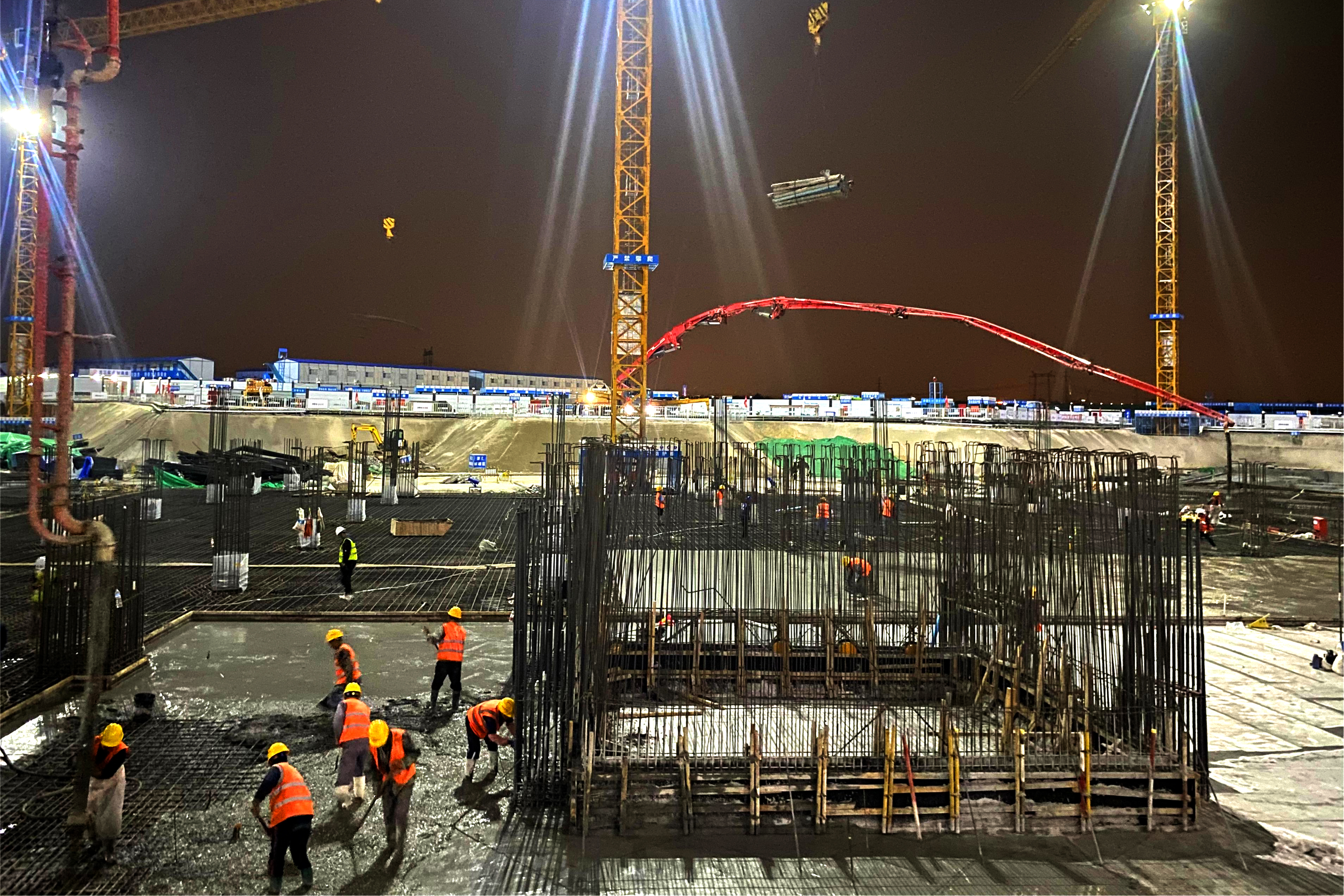 本次筏板混凝土施工使用2台84米汽车泵进行浇筑,历时30小时,共计浇筑混凝土1752立方。施工浇筑跨度大、项目标准高,项目部提前策划,精准分析施工重点难点,明确质量及安全保证措施,做好各项突发事件的应急预案。对防水施工、模板标高、钢筋保护层厚度等关键环节进行细致的检查和验收,严格按照施工规范进行操作,确保浇筑的顺利完成。