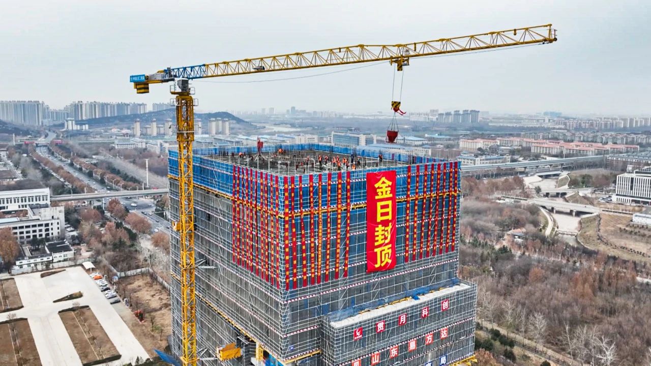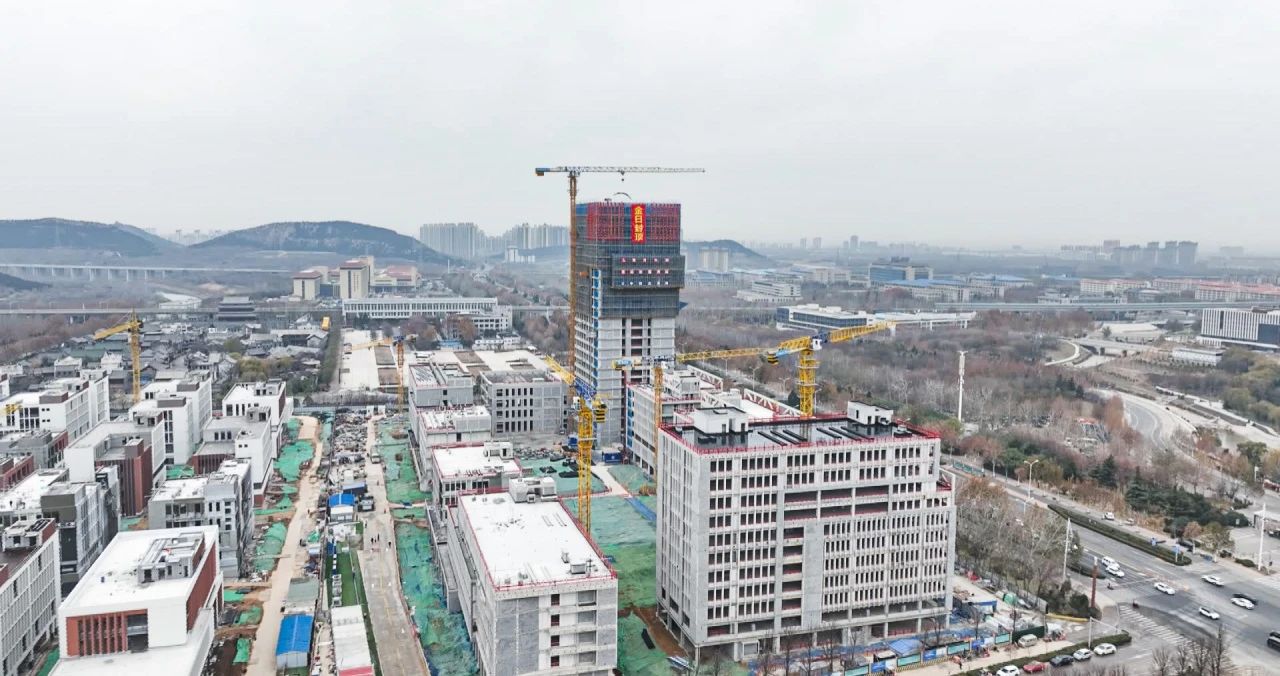 鲁澳大健康科技园是“国家中医药传承创新发展试验区”重点项目,是山东省与澳门在中医药领域合作的核心平台,由济南市、山东中医药大学、澳门科技大学三方联手打造。项目位于长清区大学路,总建筑面积19.6万㎡。项目共分为两个标段,二标段已于2024年5月封顶,当前进行封顶的属于一标段。