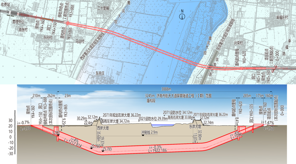 济南市航天大道穿黄隧道工程(I期)项目东起高新区航天大道与X012交叉口,向西下穿黄河后止于西岸起步区马店村,全长3888米,作为串联黄河两岸的骨干线,是山东省、济南市重点项目,对提升省市形象、改善人居出行、搭建城北片区骨架路网起到重要的支撑带动作用。