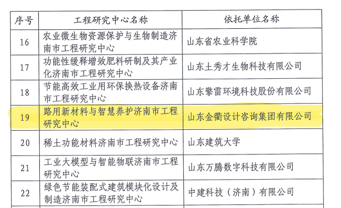 所属山东金衢设计集团有限公司“路用新材料与智慧养护济南市工程研究中心”(以下简称工程研究中心)经严格考察、评审和公示,成功入选,这是2024年金衢集团公司继济南市重点实验室、专家工作站、服务业创新中心后获批的又一科创平台。