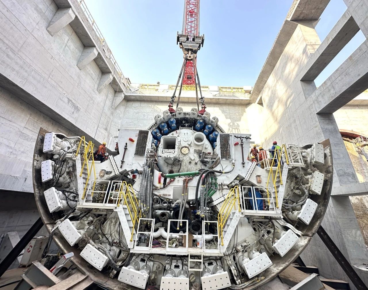 目前,济南市航天大道穿黄隧道工程“启航号”盾构机总体组装进度过半,配套设备组装完成60%,进入了入地组装的关键阶段,接下来还将进行盾构机的刀盘下井吊装工作,并全面开展盾构机始发前的整体安装调试。